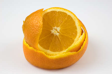 Top view of one orange round fruit on a white background. Rich citrus texture. Copy space.