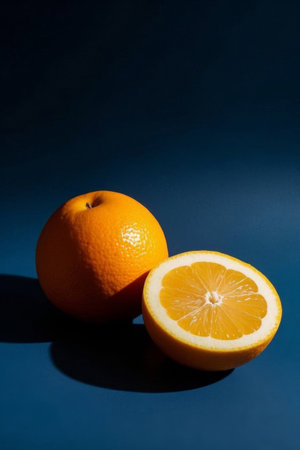 Juicy orange whole and half painted in black on a monochrome black background. Creative food concept. Citrus exotic fruit idea.