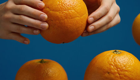 Close-up of a hand holding a fresh orange against a vibrant, colorful background, highlighting the fruit's texture and juiciness.
