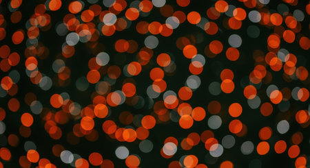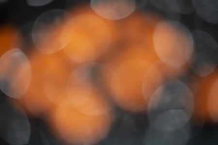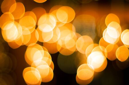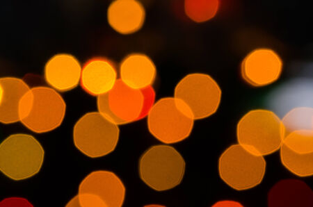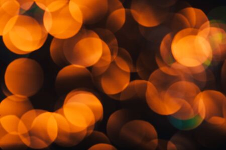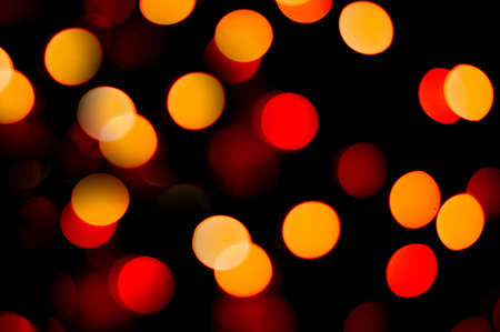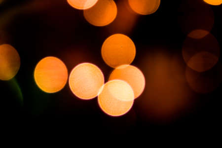 Defocused bokeh lights on black background, an abstract naturally blurred backdrop for Christmas eve or birthday party. Festive light texture. Yellow and red garland in blur. Overlay effect for design