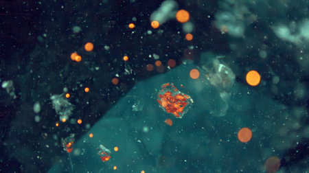Close-up abstract view of orange glowing particles and bubbles suspended in a dark, teal-colored liquid, creating a mesmerizing, ethereal effect.