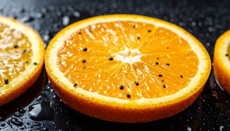 Orange slices with kiwi seeds on a dark wet reflective surface Clear details and vibrant colors enhance visual...