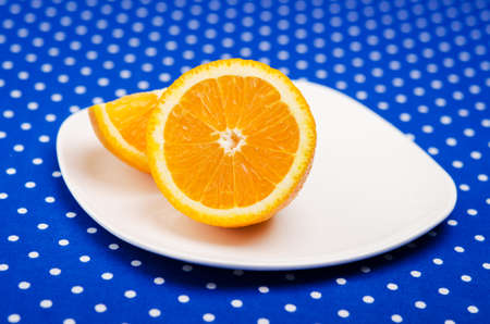 Fresh ripe orange closeup. half an orange on a blue background. copy space. close up