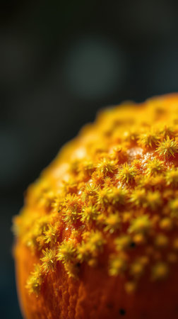 Close-up view of vibrant orange fruit covered in tiny yellow flowers during bright sunlight in a garden