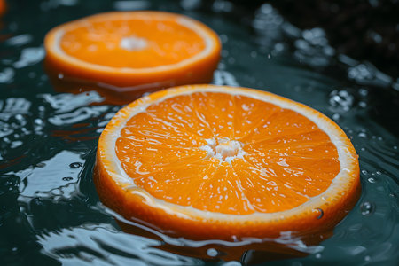 Fresh orange slices float gracefully in water, creating a vibrant and refreshing scene. ideal for themes related to refreshment, spa relaxation, wellness, healthy living, and natural beauty. the close-up view accentuates the bright color and texture of the oranges. Generative AI