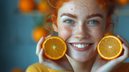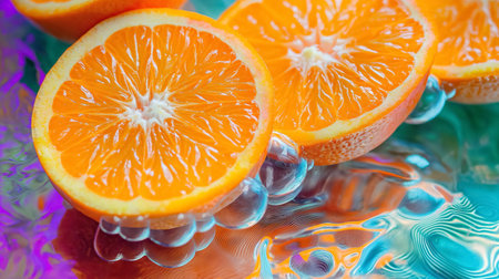 Vibrant, juicy oranges cut in half rest on a reflective surface, surrounded by an abstract, colorful water ripple effect.