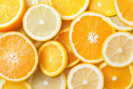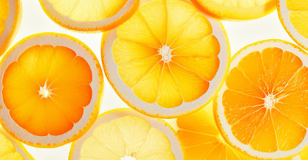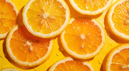 A creative digital illustration depicting Versatile creative background of citrus slice patterns in bright yellows and oranges, juicy cross-sections, fresh sunlight lighting, vibrant summery mood. This AI-generated artwork features unique visual elements suitable for various commercial and editorial applications. AI-generated illustration.