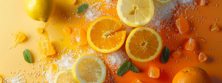 Top view of sliced lemon and orange scattered on a vibrant yellow-orange background, accompanied by sea salt and mint leaves. Perfect for culinary and summer concepts.