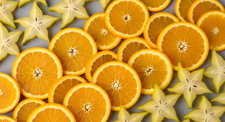 A vibrant flat lay pattern of fresh orange and starfruit slices arranged on a textured grey background. The image showcases the juicy texture and bright yellow and orange colors of the healthy tropical fruits.