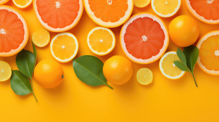 A colorful flat lay of sliced citrus fruits, including oranges and lemons, creatively arranged on a vibrant yellow background.