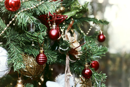 Decorated Christmas tree on blurred background. Christmas decoration. Hanging red balls on pine branches christmas tree garland and ornaments over abstract bokeh background with copy space
