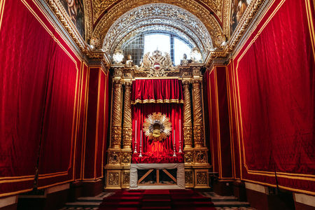 Valletta, Malta – April 10, 2025: Ornate gilded chapel with rich red velvet drapes and Baroque gold altar in St John’s Co-Cathedral, magnificent religious interior