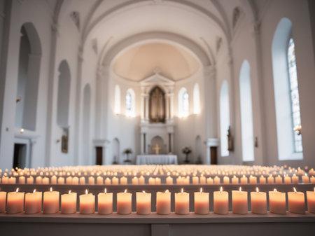 AI Generated. Rows of lit candles glow softly inside church
