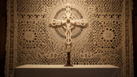 A beautifully detailed golden cross rests on an altar inside a Christian church, surrounded by soft, warm lights that create a serene atmosphere for worship.