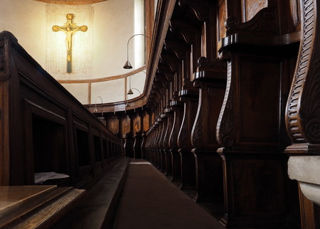 Rows of church benches at the old european catholic church.
