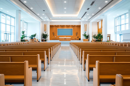 A spacious and modern sanctuary interior featuring elegant wooden seating, bathed in bright natural light. Ideal for community gatherings and spiritual events.