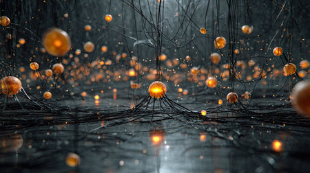 This image presents a digital artwork featuring glowing spherical elements interconnected by thin lines. The composition showcases a dark ambiance with diffused lighting creating a mysterious atmosphere. Suitable for use in conceptual projects, it may also appeal to technology, science, and design-related materials.