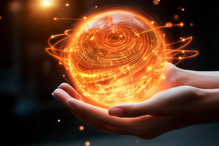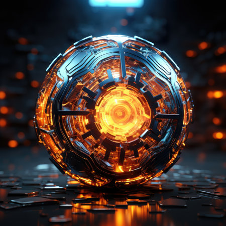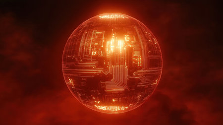A striking glowing digital sphere filled with intricate circuit patterns set against a fiery background, evoking themes of technology and innovation.
