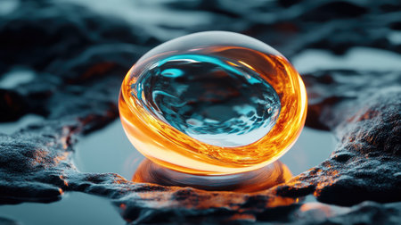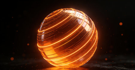 A glass sphere with an orange light emanating from its base sits on a dark surface