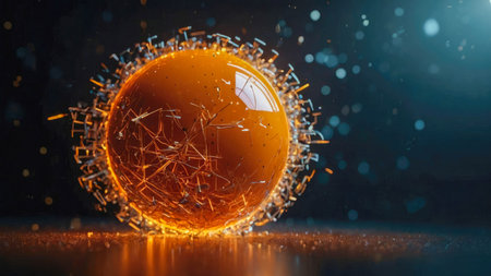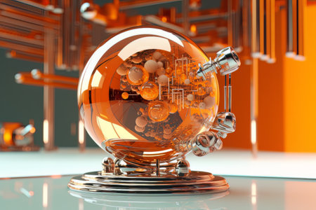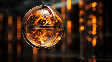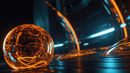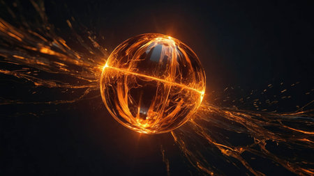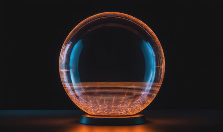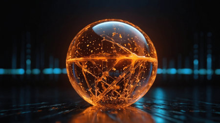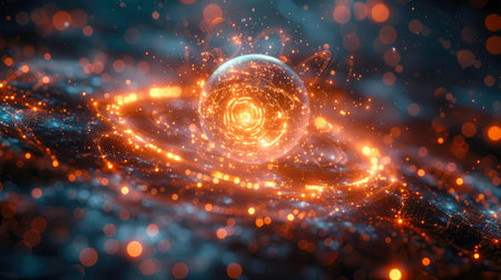 Glass energy abstract sphere with particles and glowing lights on a dark background.
