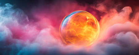 Glowing orb surrounded by colorful clouds, mystical atmosphere. Fantasy and imagination concept