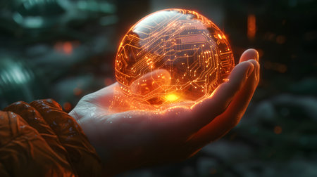 Human hand holding a glowing crystal ball with microchip inside. 3D rendering