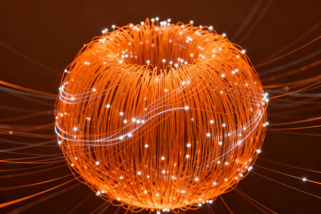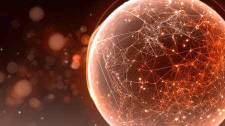 An abstract digital illustration showcases a sphere overlaid with a network of connecting lines and nodes. The image features a warm color palette dominated by orange and brown tones. Subtle bokeh effects and blurred areas add depth. Suitable for various design projects and visual content needs.