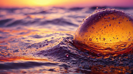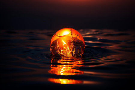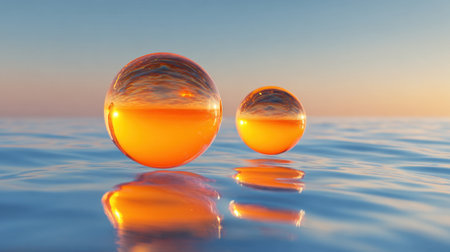 Two transparent spheres rest on calm water, reflecting a vibrant sunset. The warm colors of orange and pink fill the sky, creating a peaceful and beautiful scene.