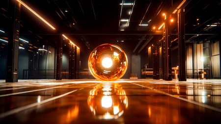 Large glass ball sitting on top of floor in dark room. Generative AI.