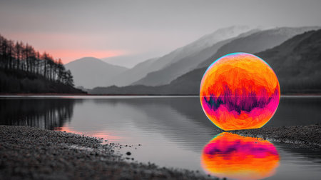 A crystal ball captures the vibrant sunset, reflecting on tranquil water