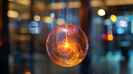 Close up of a luminous, orange hued glass sphere adorned with sparkling particles, set against a backdrop of blurred bokeh lights, creating a festive
