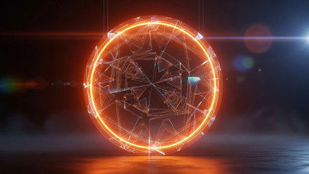 A luminous orange ring hangs in a dark void, showcasing intricate crystalline formations and dramatic light flares emanating from its core.