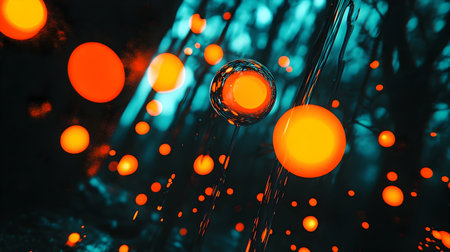 Abstract image featuring glowing orange spheres against a teal background. The vibrant color contrast and unique texture make it suitable for various design projects.