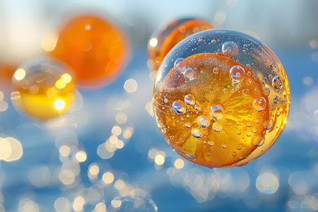Conceptual image showcasing sliced oranges encapsulated in transparent bubbles, floating against a blue abstract bokeh background. the vibrant composition highlights freshness, summer, and a sense of citrus vitality in a unique and artistic presentation. Generative AI