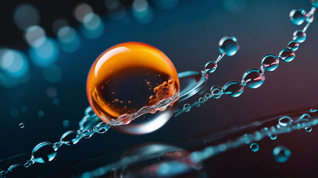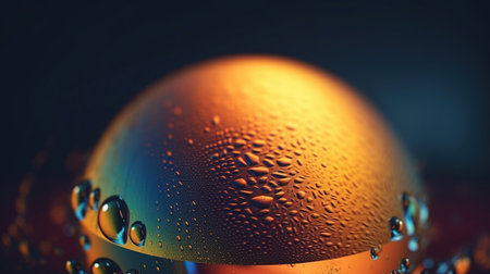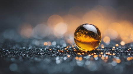 This elegant macro photo captures a golden water droplet resting on a glossy surface, enhanced by a beautiful bokeh effect that creates a dreamy atmosphere.