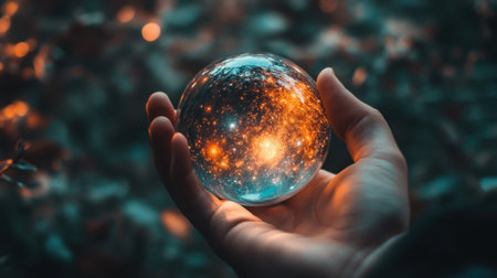 Human hand holding a crystal ball on the background of nature.