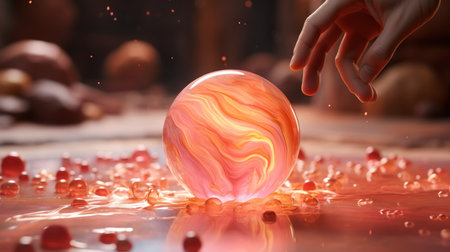 Delicate orb rests on sleek, dark surface, reflecting spectacular array of colorful bokeh lights. Blurred, radiant lights in background. Beauty of light and reflection in artistic arrangement. AI