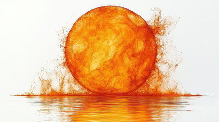 A stunning artistic representation of a bright sun rising from the water, showcasing vibrant orange tones and mesmerizing reflections, evoking a sense of serenity and warmth.
