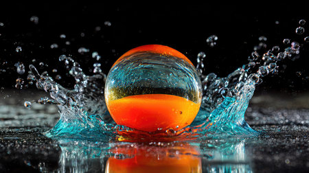 An orange sphere interacts with water, resulting in dynamic splash formations. The image displays a macro-style composition, featuring bright colors like orange and blue against a dark background. The scene suggests movement and impact. Suitable for commercial purposes, including advertising and artistic illustrations.