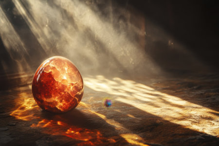 A vibrant amber egg sits on a rustic surface, illuminated by beams of light creating a warm atmosphere.