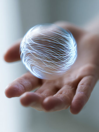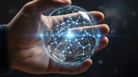 A human hand cradles a luminous digital sphere with intricate blue light connections and glowing...