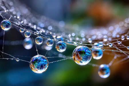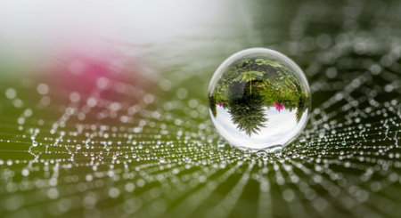 A tiny glistening sphere clings gently to delicate threads, mirroring golden highlights amidst a dreamy, blurred backdrop that evokes calmness and enchantment.