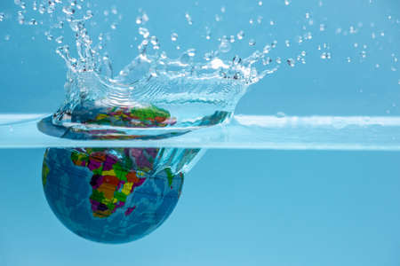 Planet Earth in the form of a globe is submerging in clear water, forming splashes. Concept of caring for the environment and keeping water clean