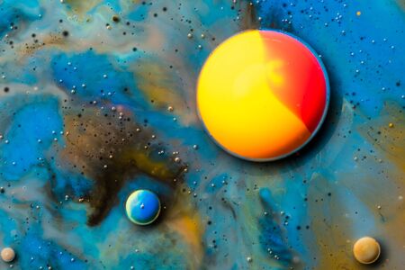 Macro universe, platnets and stars in it, multi-colored paints. Universe in a plate.