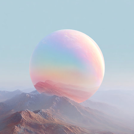 A striking surreal scene with a pink and blue abstract pastel sphere, gently floating among delicate foam bubbles, set against a soft gradient background.