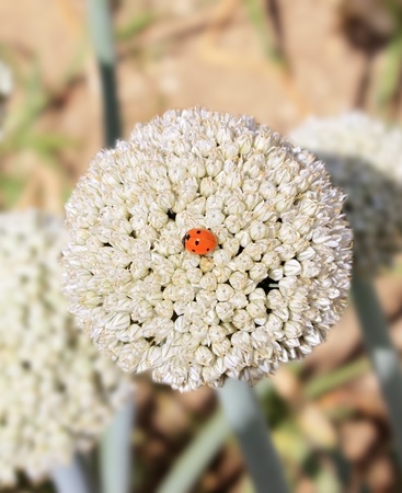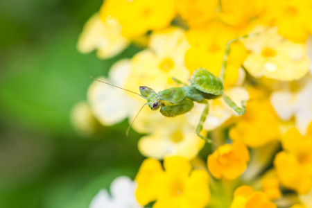 A smiling preying mantis looks into the camera while sitting on a flower in central Kanagawa Prefecture, Japan