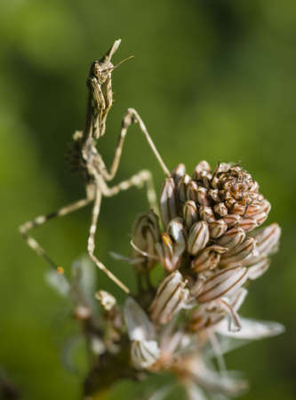 Detailed macro photo of a green grasshopper with long antennae and spiny legs
