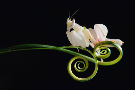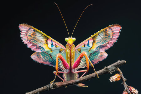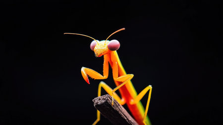 A close-up shot of a colorful praying mantis, showcasing its intricate details and unique posture, set against a stark black backdrop.