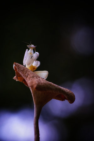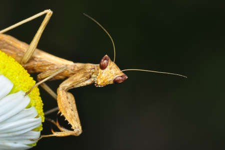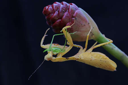A yellow praying mantis is looking for prey in a wildflower on a black background. This insect has the scientific name Hierodula sp.