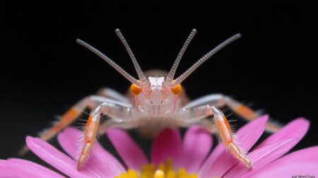 A close-up shot of a small insect with orange legs and antennae perched on a pink flower, showcasing intricate details.
